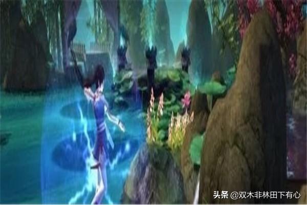 桃林往上方走,会被挡回来。往右走到场景二,右下方灵池边石头上看见女孩子的衣服。池中有一少女正在沐浴,逍遥把衣服挂在树枝上,求换灵药。(灵儿初次登场,惊艳,俘获多少少男滴心呀呀~~)仙女答应了,让逍遥躲远些。逍遥等半天不见仙女回去寻找,惊见天雷劈倒当场。仙女出现欲劈死逍遥,可问明白原由后,决定带逍遥去取灵药。此时桃林往上就能走了,过桥来到水月宫。