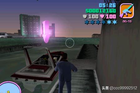 5、登上船,将它开到迪亚兹的豪宅。一路上会有警察堵截你,朝你开枪,不用去管它直接朝着小地图上的粉红色的小点前进。