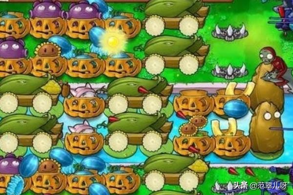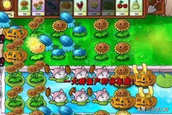 1、在一至五列(或一至六列,个人喜好呗)种向日葵,僵尸来了就放上土豆、窝瓜,为以后种香蒲(猫草)拖延时间。