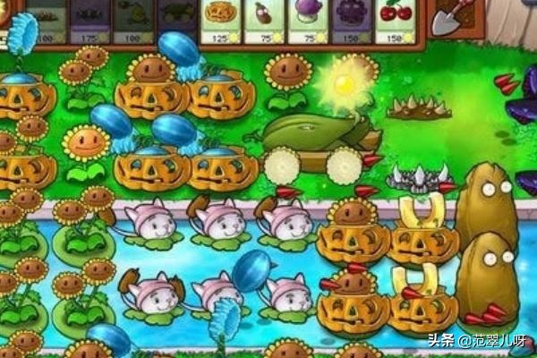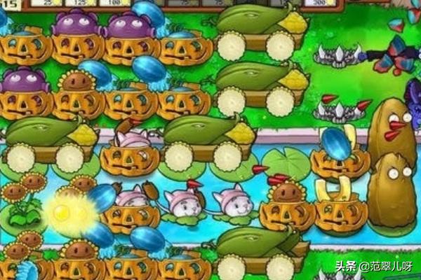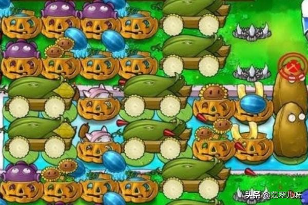 6、全场植物带上南瓜套。建议有危险的先带套。另外,也可随意套哈,纯属娱乐。一般先套第一列植物(挖地僵尸出来的那一列呗),接着套忧郁菇和冰瓜等珍贵的植物,最后全部套完。