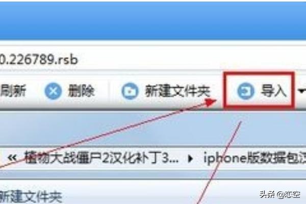 第三步:解压从本站下载到的植物大战僵尸2中文版RSB文件包,解压后的文件夹内有iPhone和iPad两个版本,不同设备的用户选择对应的RSB文件,通过iTools、快用苹果助手等第三方工具的导入功能,将RSB文件导入到iPhone/iPad文件夹内。