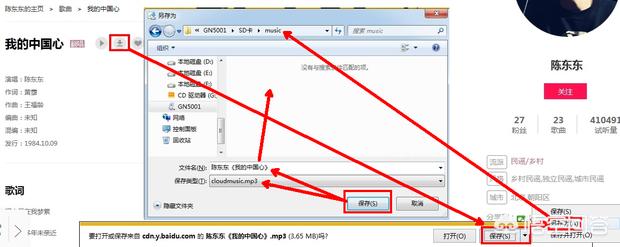 第三步,点击进入到下载页面后,再看到歌曲名旁边有一个下载标志,点击下载后,IE底部会弹出一个保存栏选择,我们点击保存旁的向下标志选择“另存为”,这时就会出现一个选择框,我们点击计算机选择MP3播放器中的music文件夹进行保存就可以了(如下图):