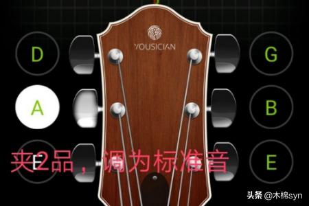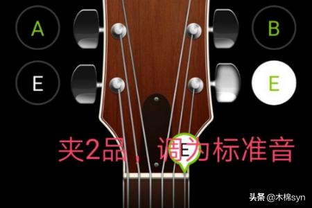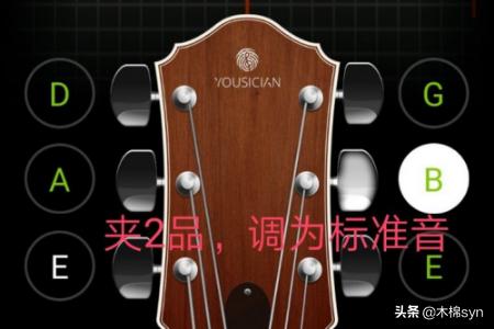 5、调1弦,变调夹夹住2品,在用调音器调到标准音E,就得到了D。