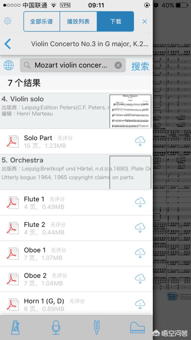 基本上都是点击出来的结果的第一个,搜索的时候看看关键字眼是否符合,然后点进去。搜出来后,像这种协奏曲有总谱或者分谱,根据你的需要来下载